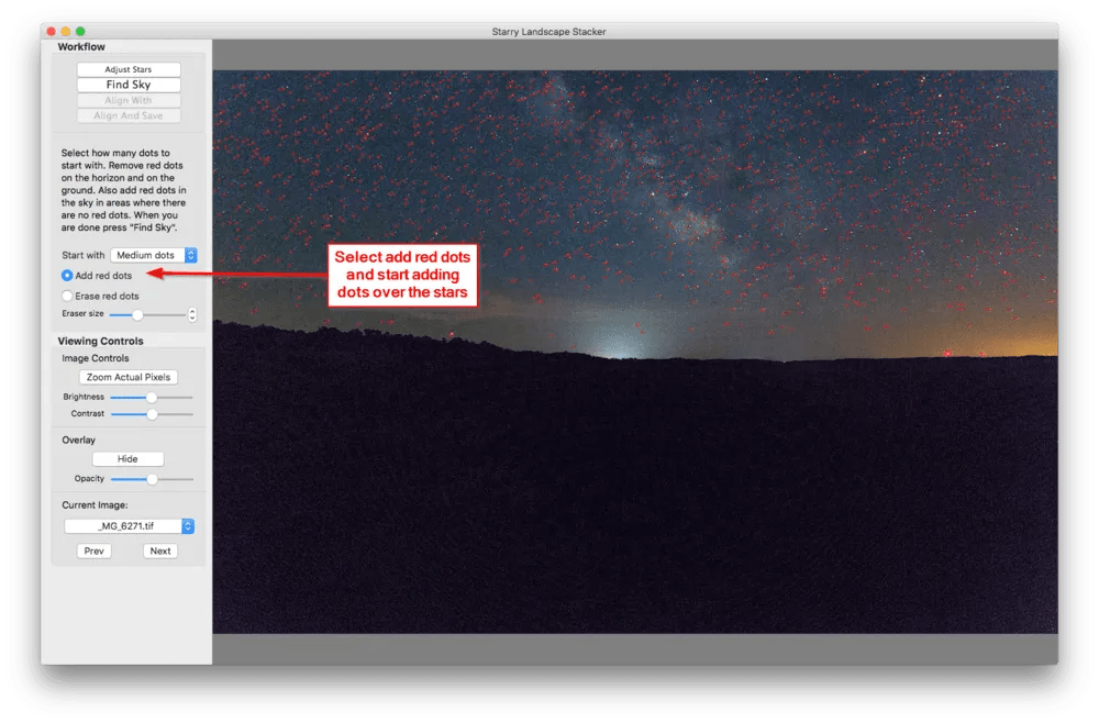Now that we’ve removed the dots from the foreground, we want to add more to the sky. The idea is to place these dots over the stars in the sky. We certainly don’t have to do it with all the stars, but the more stars we put a dot on, the better our end result will be. Also, the more we can place along the horizon, the easier life will be in a bit. So, select the Add red dots brush and start placing red dots over those stars. Tip: You can zoom in and out in Starry Landscape Stacker by using the Z key.