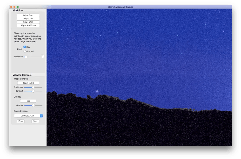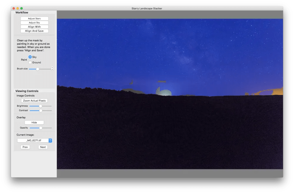 To stack images, we will use a special piece of software. For this tutorial, I will be using an app called Starry Landscape Stacker, which is, unfortunately, a MacOS-only app. It’s said that Sequator is a good Windows alternative to Starry Landscape Stacker, but I’m yet to get a result out of it that I’m happy with. If I ever do, I’ll write up a tutorial of how I did it.