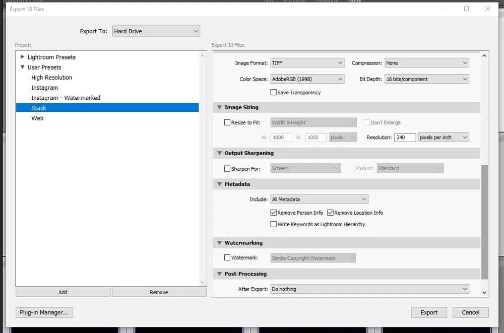 Once your settings are synced, select all your frames and export them as TIF files. The settings you want for this export is a full resolution, 16-bit TIF file. Make sure you export the images with all the metadata, since Starry Landscape Stacker uses some of this information to help it align the frames. Export them to a folder so you can easily locate them again.