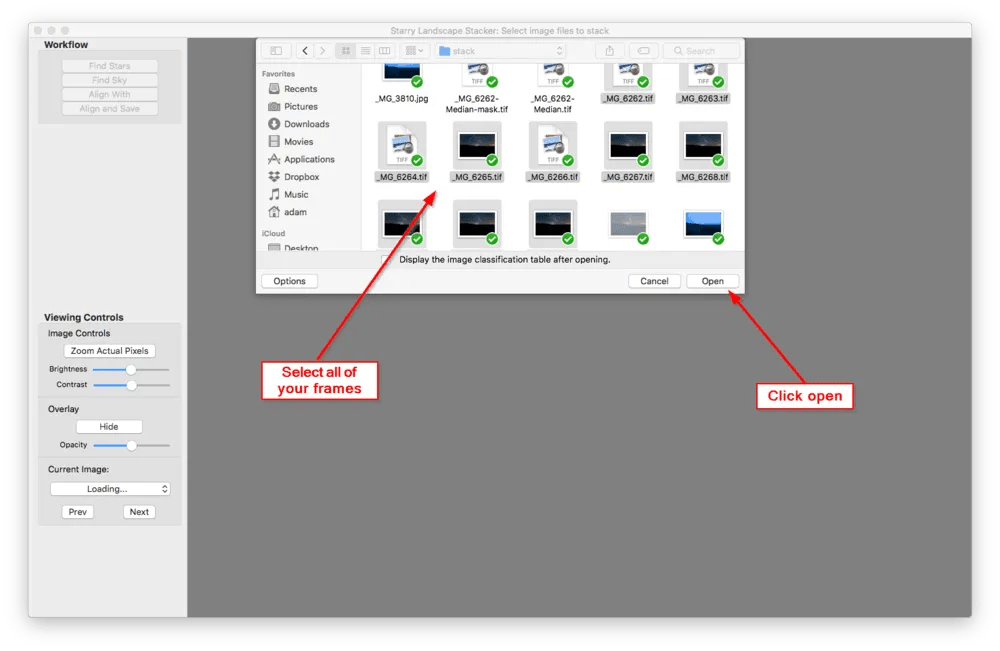 When you first open Starry Landscape Stacker, it’ll open up a dialog to open your images. Simply navigate to and select all your frames (in my case, there are 10 of them) and hit open. Note that you can select multiple files by command-clicking them.