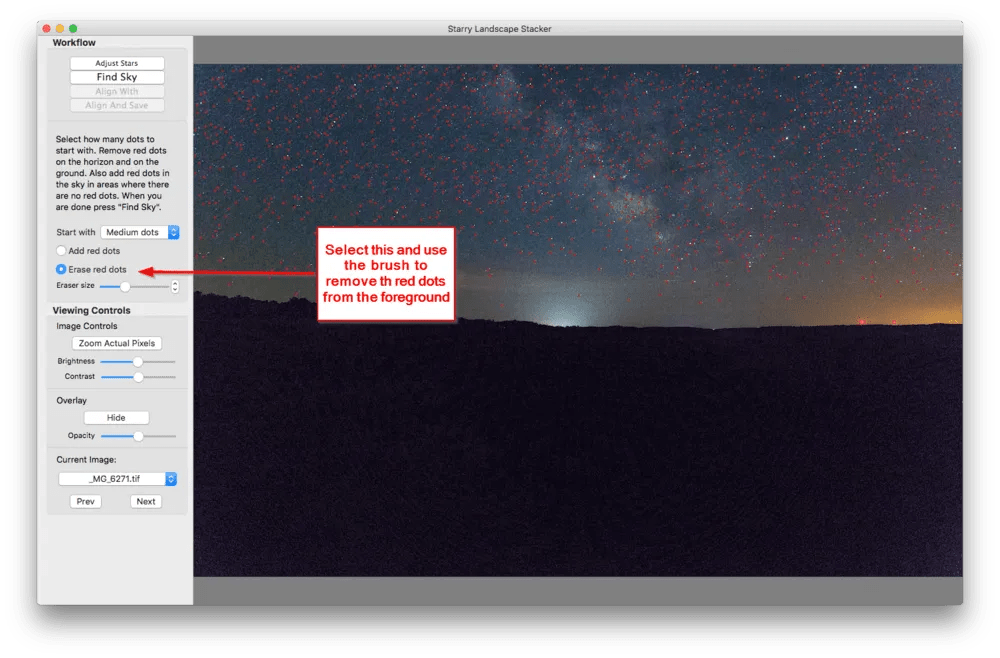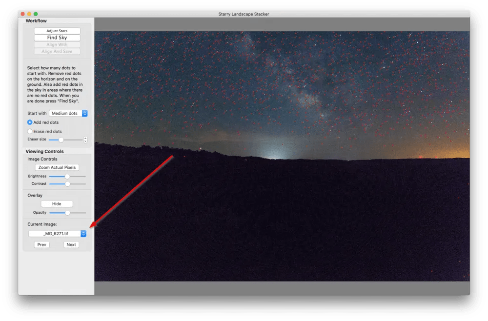 You’ll notice a couple of things about this view. Number 1, there are a bunch of red dots all over your image. These are points that Starry Landscape Stacker uses to help it align the images and detect the sky. We will be refining these momentarily.