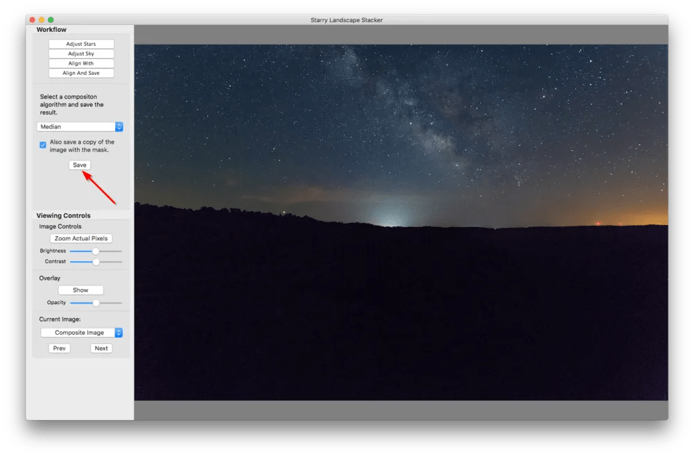 Assuming you’re happy with the results, hit the save button. This will bring up a save file dialog for both the stacked image, as well as the masked sky. Choose where you want to save them and you should end up with two files.
