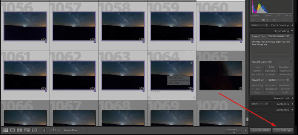 Once you get your basic edit dialed in, select all your Milky Way frames and select the ‘synchronize’ option in Lightroom to sync all the edits you just made.