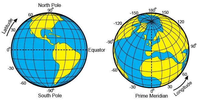 Latitude is measured from 0° to 90°, north and south, starting from a spot called the equator, which is just an imaginary line that runs through the center of the planet, dividing it into two separate hemispheres.