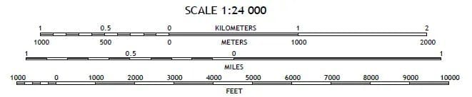- The scale is 1:24,000. This equals 2.5 inches, roughly equaling 1 mile (or 4 centimeters to one kilometer).