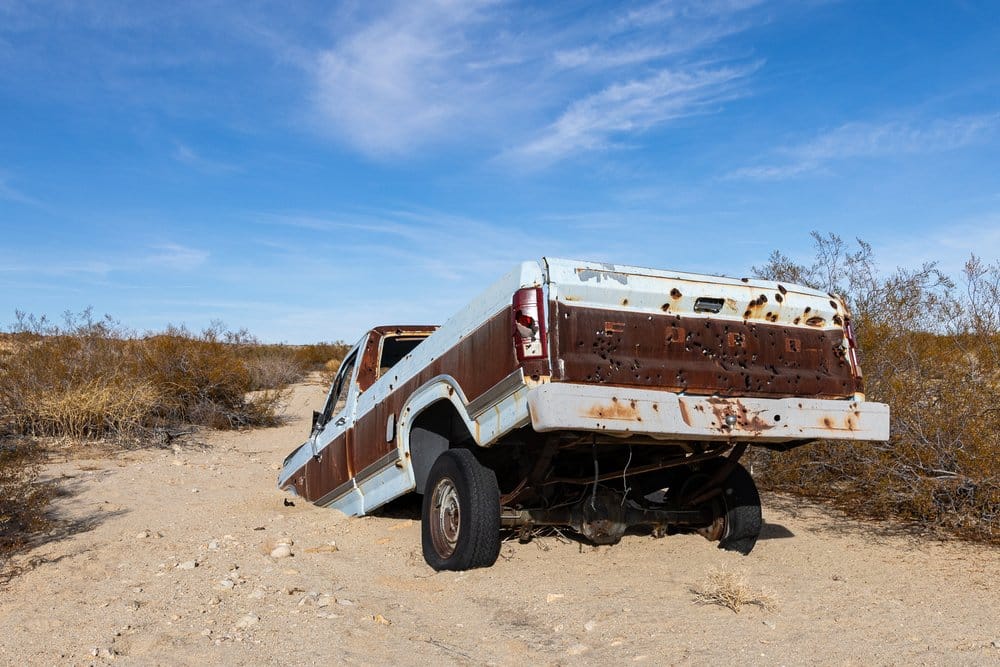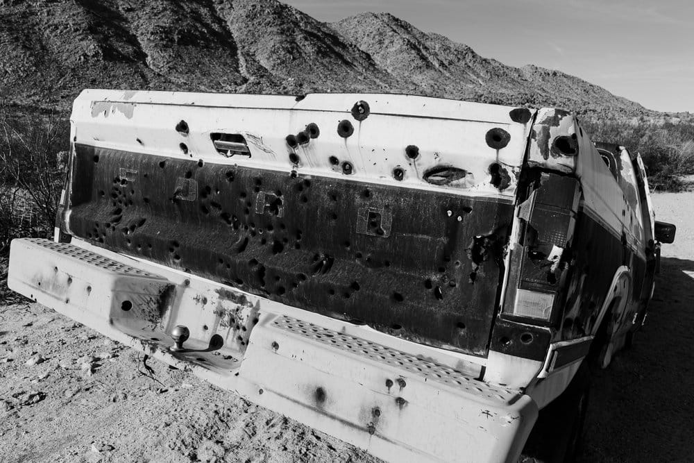 Your guess is as good as mine as to how this old Ford F-150 came to be so hopelessly stuck out here. While the terrain isn’t overly difficult, it is in a very remote wash that is about 2 miles straight line from the nearest road. It’s clearly been out here for some time. It’s also apparent that someone had been using this old truck for target practice, as it is riddled with bullet holes, and there are still some rifle casings scattered around the ground.