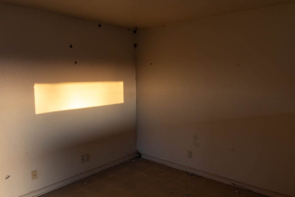 As the sun was setting on this beautiful day, I explored the stripped-out shells of these homes, looking for potential compositions. The evening light made for some interesting scenes, and I found myself drawing on inspiration from the work of Todd Hido with the shots I took.